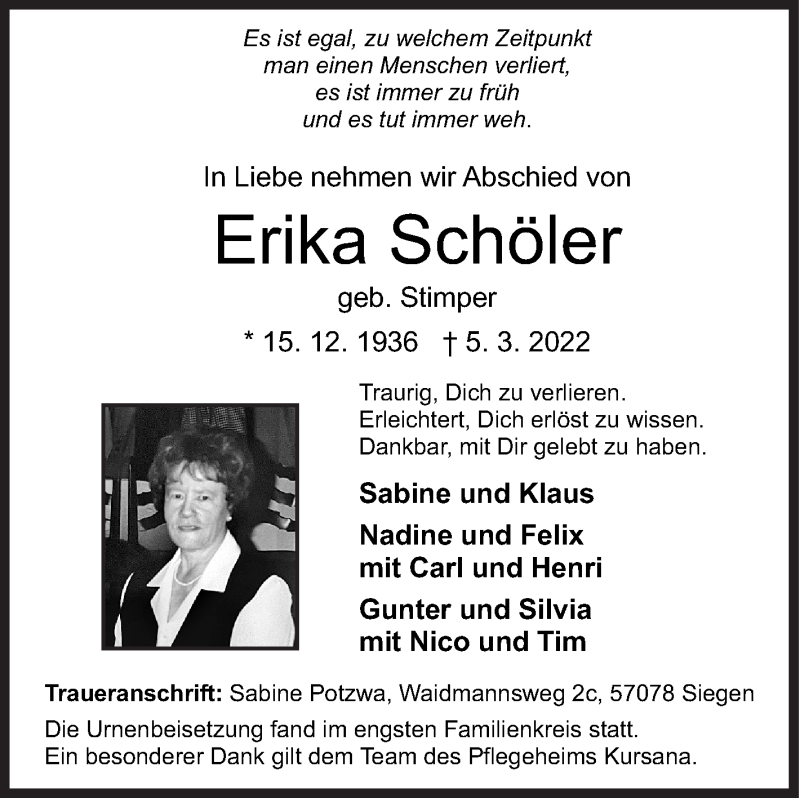 Hier finden Sie alle Traueranzeigen aus der Zeitung, die bisher für Erika Schöler erschienen sind. Weitere Traueranzeigen, die in der Zeitung erscheinen, werden hier ebenfalls aufgelistet