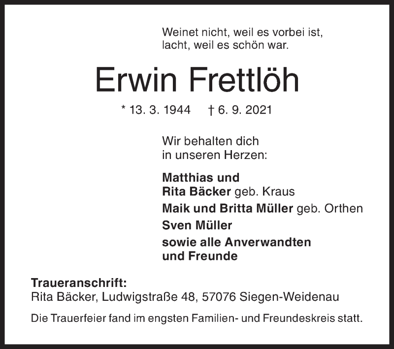 Hier finden Sie alle Traueranzeigen aus der Zeitung, die bisher für Erwin Frettlöh erschienen sind. Weitere Traueranzeigen, die in der Zeitung erscheinen, werden hier ebenfalls aufgelistet