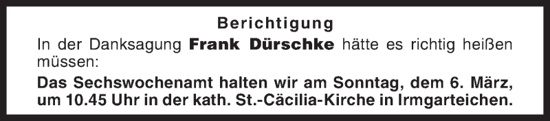 Hier finden Sie alle Traueranzeigen aus der Zeitung, die bisher für Frank Dürschke erschienen sind. Weitere Traueranzeigen, die in der Zeitung erscheinen, werden hier ebenfalls aufgelistet