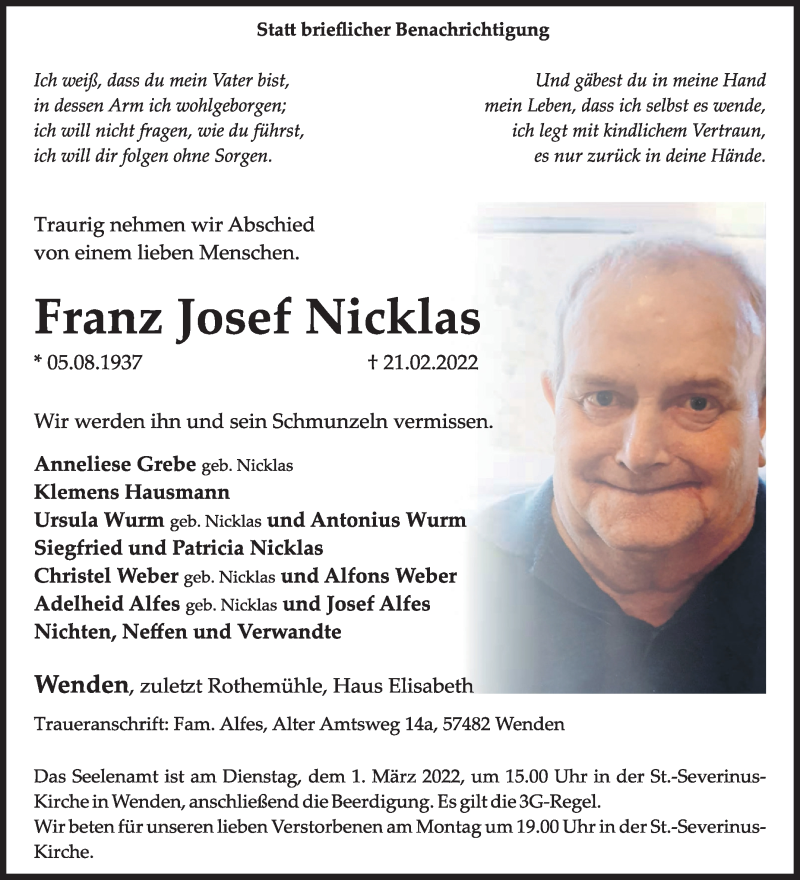 Hier finden Sie alle Traueranzeigen aus der Zeitung, die bisher für Franz Josef Nciklas erschienen sind. Weitere Traueranzeigen, die in der Zeitung erscheinen, werden hier ebenfalls aufgelistet