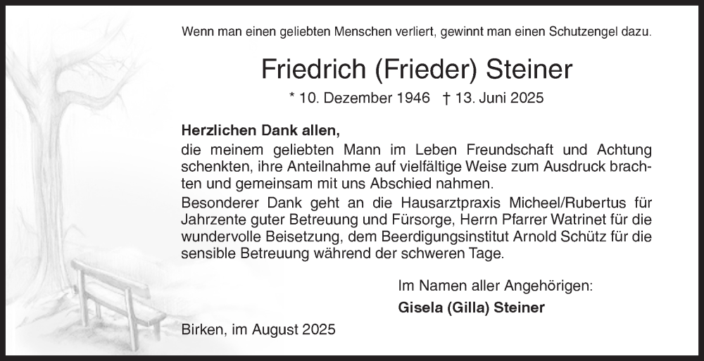 Hier finden Sie alle Traueranzeigen aus der Zeitung, die bisher für Friedrich Steiner erschienen sind. Weitere Traueranzeigen, die in der Zeitung erscheinen, werden hier ebenfalls aufgelistet