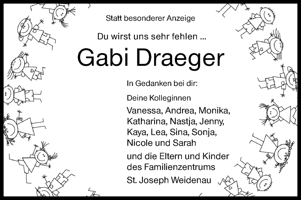 Hier finden Sie alle Traueranzeigen aus der Zeitung, die bisher für Gabi Draeger erschienen sind. Weitere Traueranzeigen, die in der Zeitung erscheinen, werden hier ebenfalls aufgelistet
