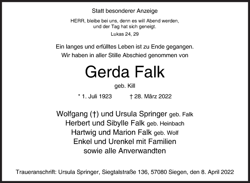 Hier finden Sie alle Traueranzeigen aus der Zeitung, die bisher für Gerda Falk erschienen sind. Weitere Traueranzeigen, die in der Zeitung erscheinen, werden hier ebenfalls aufgelistet