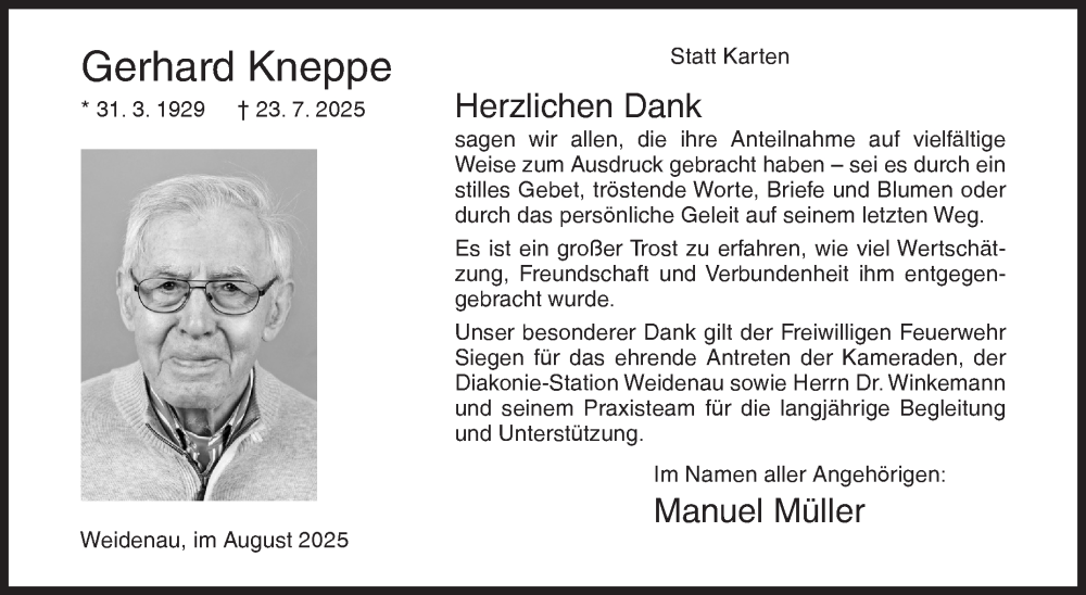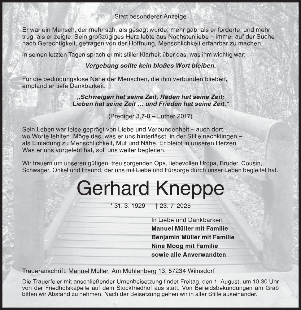 Hier finden Sie alle Traueranzeigen aus der Zeitung, die bisher für Gerhard Kneppe erschienen sind. Weitere Traueranzeigen, die in der Zeitung erscheinen, werden hier ebenfalls aufgelistet