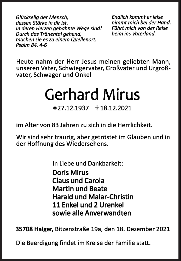 Hier finden Sie alle Traueranzeigen aus der Zeitung, die bisher für Gerhard Mirus erschienen sind. Weitere Traueranzeigen, die in der Zeitung erscheinen, werden hier ebenfalls aufgelistet