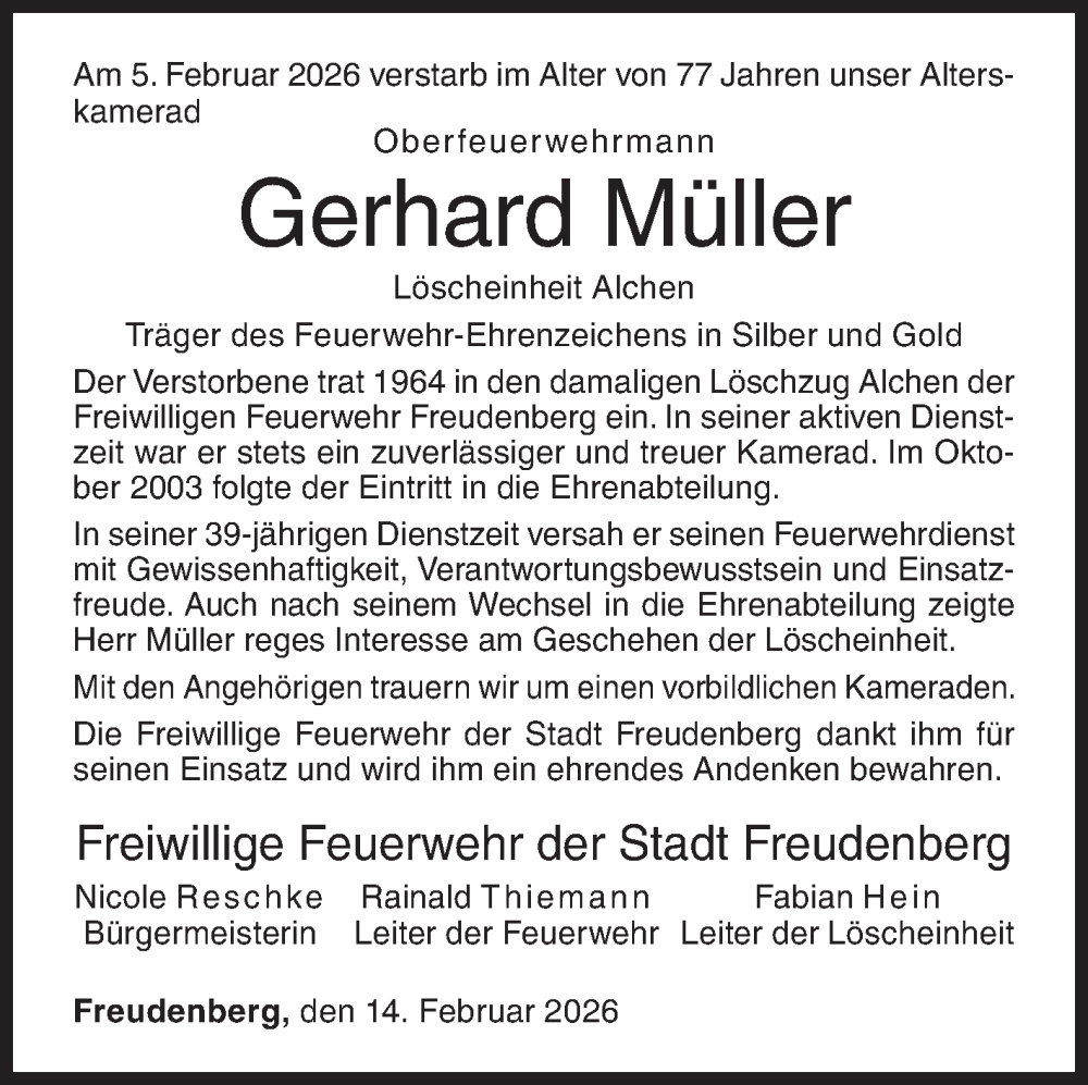 Hier finden Sie alle Traueranzeigen aus der Zeitung, die bisher für Gerhard Müller erschienen sind. Weitere Traueranzeigen, die in der Zeitung erscheinen, werden hier ebenfalls aufgelistet