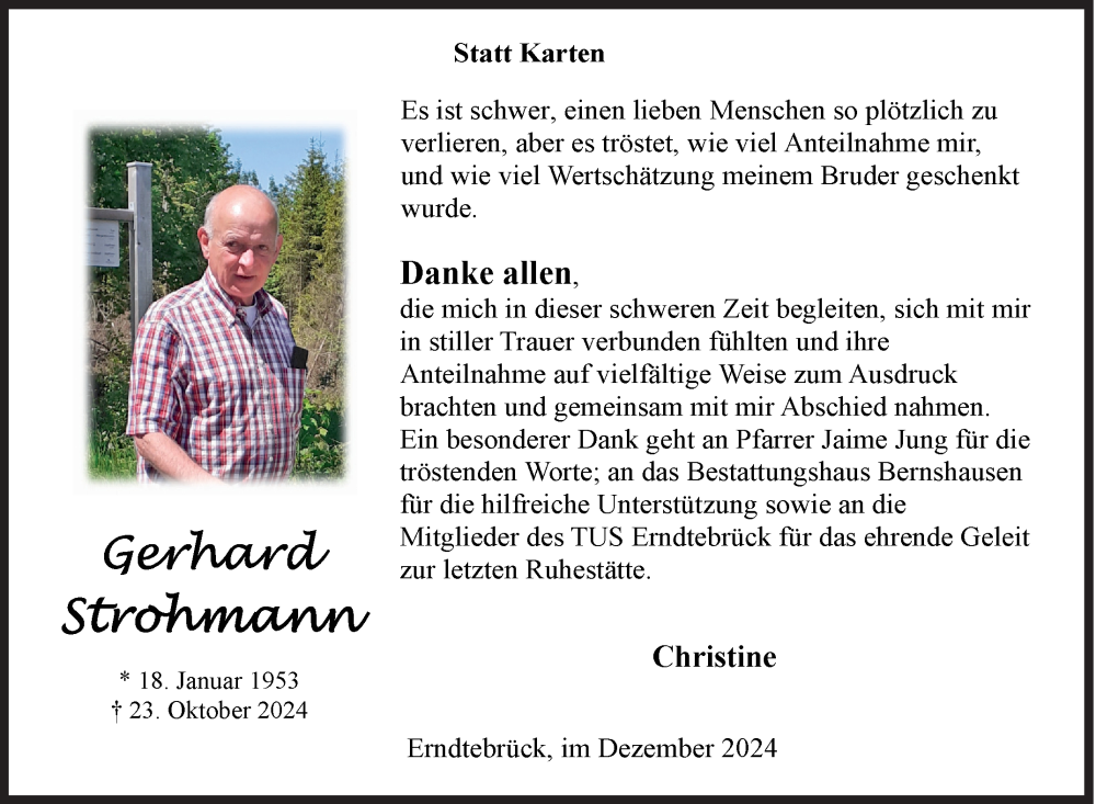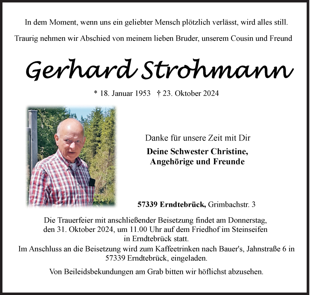 Hier finden Sie alle Traueranzeigen aus der Zeitung, die bisher für Gerhard Strohmann erschienen sind. Weitere Traueranzeigen, die in der Zeitung erscheinen, werden hier ebenfalls aufgelistet