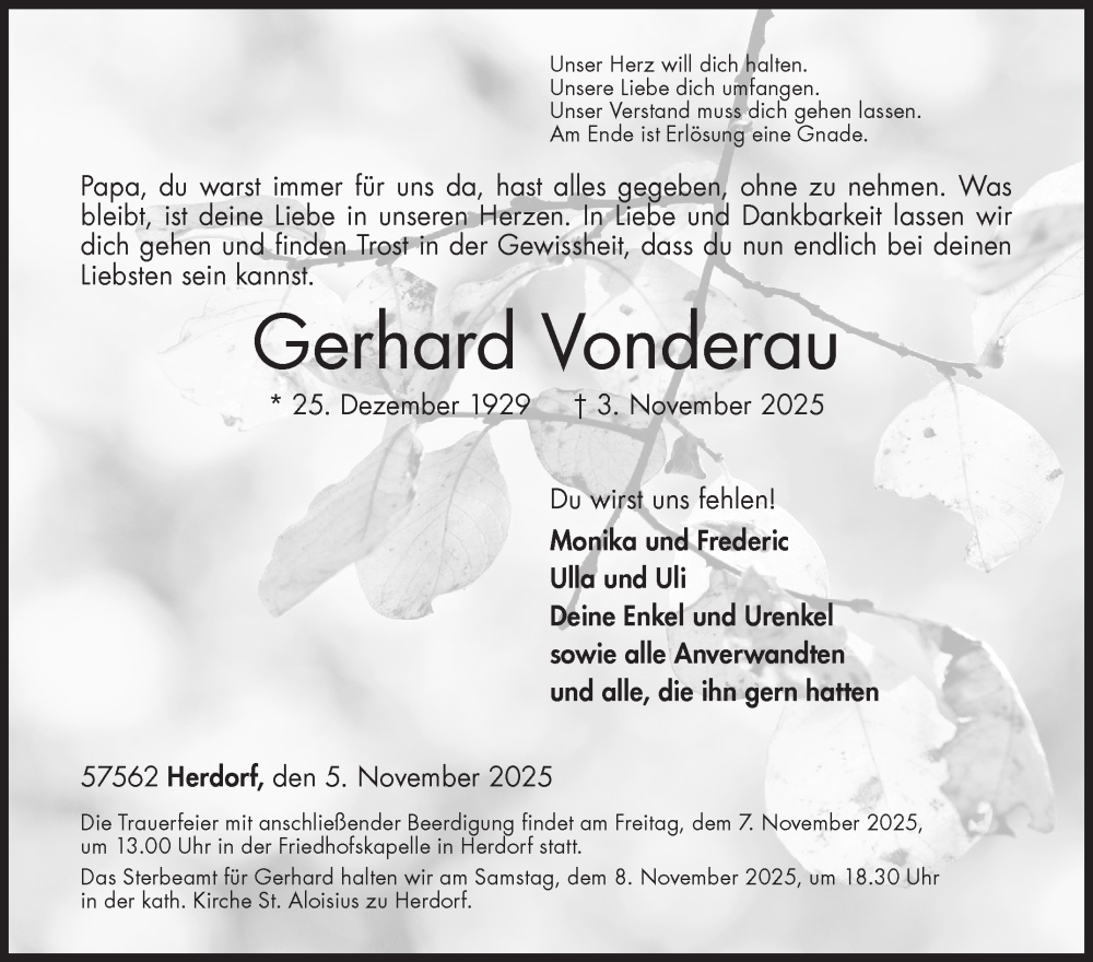 Hier finden Sie alle Traueranzeigen aus der Zeitung, die bisher für Gerhard Vonderau erschienen sind. Weitere Traueranzeigen, die in der Zeitung erscheinen, werden hier ebenfalls aufgelistet