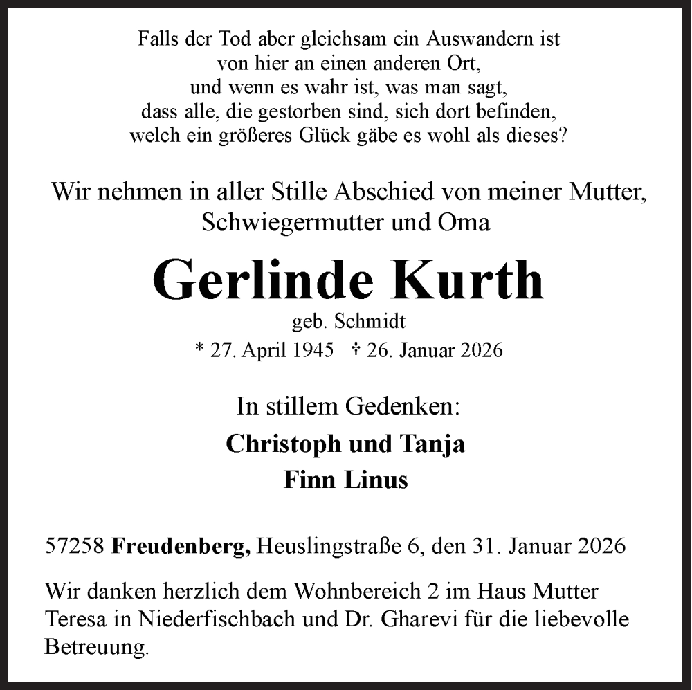 Hier finden Sie alle Traueranzeigen aus der Zeitung, die bisher für Gerlinde Kurth erschienen sind. Weitere Traueranzeigen, die in der Zeitung erscheinen, werden hier ebenfalls aufgelistet