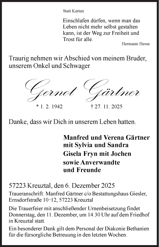 Hier finden Sie alle Traueranzeigen aus der Zeitung, die bisher für Gernot Gärtner erschienen sind. Weitere Traueranzeigen, die in der Zeitung erscheinen, werden hier ebenfalls aufgelistet