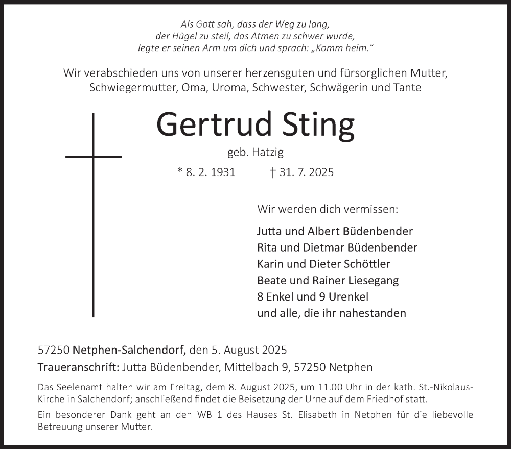 Hier finden Sie alle Traueranzeigen aus der Zeitung, die bisher für Gertrud Sting erschienen sind. Weitere Traueranzeigen, die in der Zeitung erscheinen, werden hier ebenfalls aufgelistet