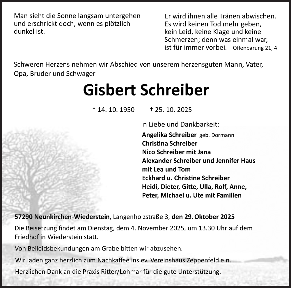 Hier finden Sie alle Traueranzeigen aus der Zeitung, die bisher für Gisbert Schreiber erschienen sind. Weitere Traueranzeigen, die in der Zeitung erscheinen, werden hier ebenfalls aufgelistet