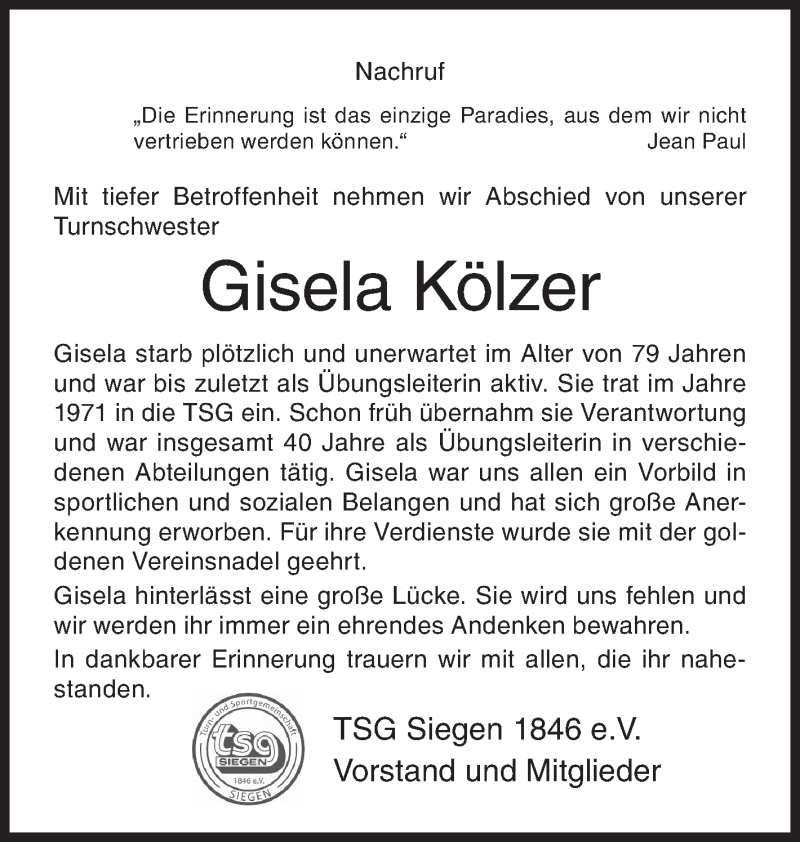 Hier finden Sie alle Traueranzeigen aus der Zeitung, die bisher für Gisela Kölzer erschienen sind. Weitere Traueranzeigen, die in der Zeitung erscheinen, werden hier ebenfalls aufgelistet