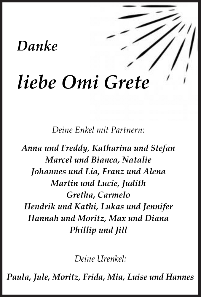 Hier finden Sie alle Traueranzeigen aus der Zeitung, die bisher für Grete erschienen sind. Weitere Traueranzeigen, die in der Zeitung erscheinen, werden hier ebenfalls aufgelistet