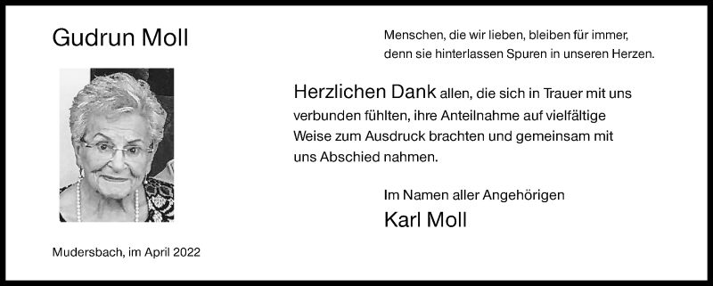 Hier finden Sie alle Traueranzeigen aus der Zeitung, die bisher für Gudrun Moll erschienen sind. Weitere Traueranzeigen, die in der Zeitung erscheinen, werden hier ebenfalls aufgelistet
