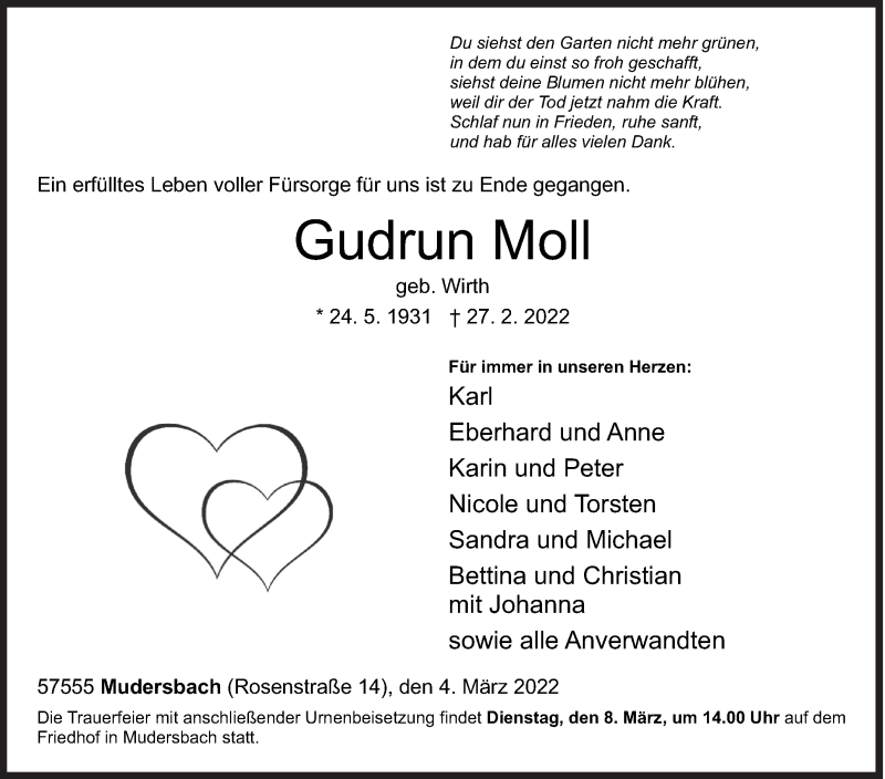 Hier finden Sie alle Traueranzeigen aus der Zeitung, die bisher für Gudrun Moll erschienen sind. Weitere Traueranzeigen, die in der Zeitung erscheinen, werden hier ebenfalls aufgelistet