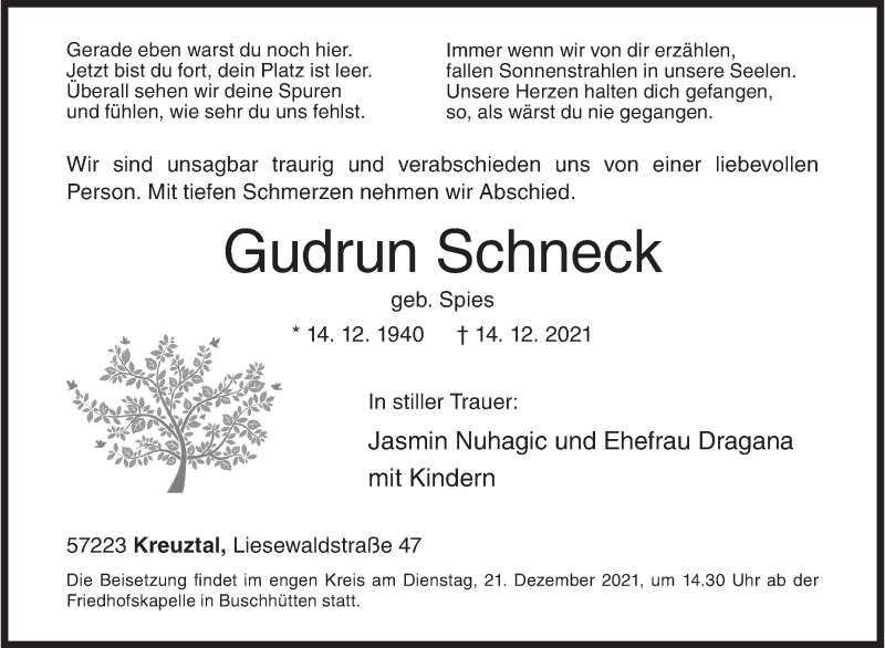 Hier finden Sie alle Traueranzeigen aus der Zeitung, die bisher für Gudrun Schneck erschienen sind. Weitere Traueranzeigen, die in der Zeitung erscheinen, werden hier ebenfalls aufgelistet