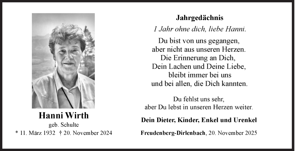 Hier finden Sie alle Traueranzeigen aus der Zeitung, die bisher für Hanni Wirth erschienen sind. Weitere Traueranzeigen, die in der Zeitung erscheinen, werden hier ebenfalls aufgelistet