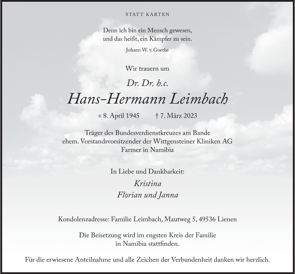 Hier finden Sie alle Traueranzeigen aus der Zeitung, die bisher für Hans-Hermann Leimbach erschienen sind. Weitere Traueranzeigen, die in der Zeitung erscheinen, werden hier ebenfalls aufgelistet
