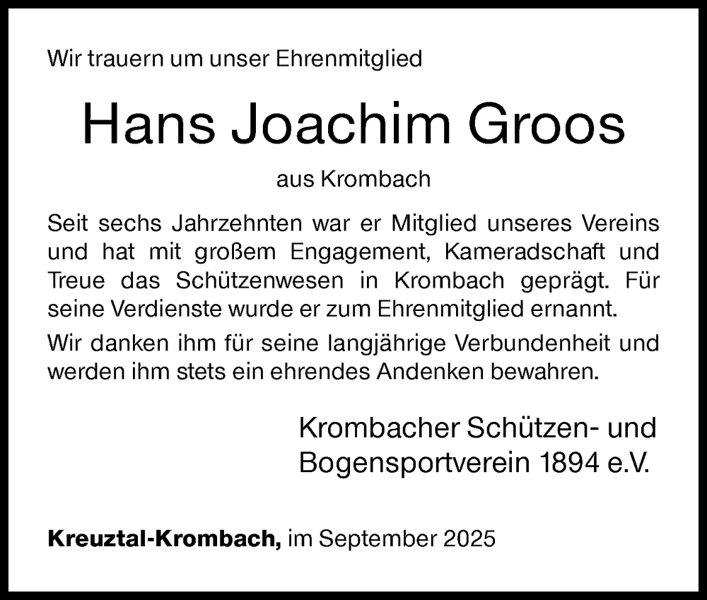 Hier finden Sie alle Traueranzeigen aus der Zeitung, die bisher für Hans Joachim Groos erschienen sind. Weitere Traueranzeigen, die in der Zeitung erscheinen, werden hier ebenfalls aufgelistet