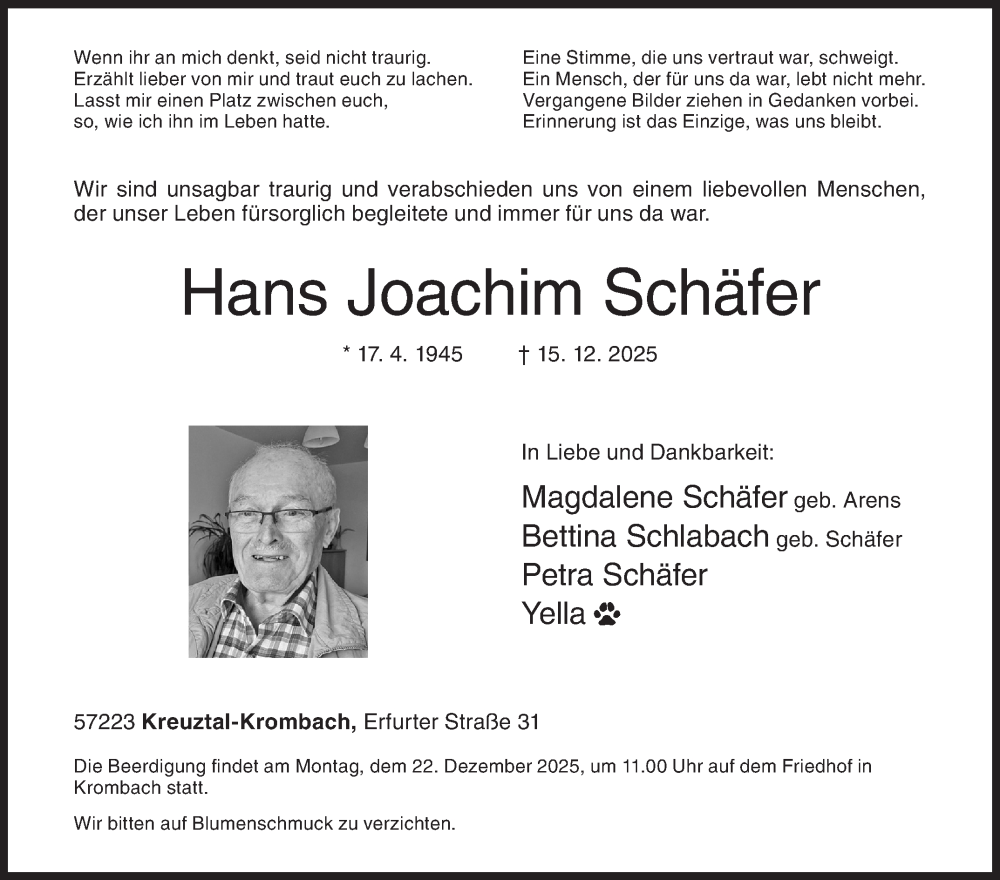 Hier finden Sie alle Traueranzeigen aus der Zeitung, die bisher für Hans Joachim Schäfer erschienen sind. Weitere Traueranzeigen, die in der Zeitung erscheinen, werden hier ebenfalls aufgelistet