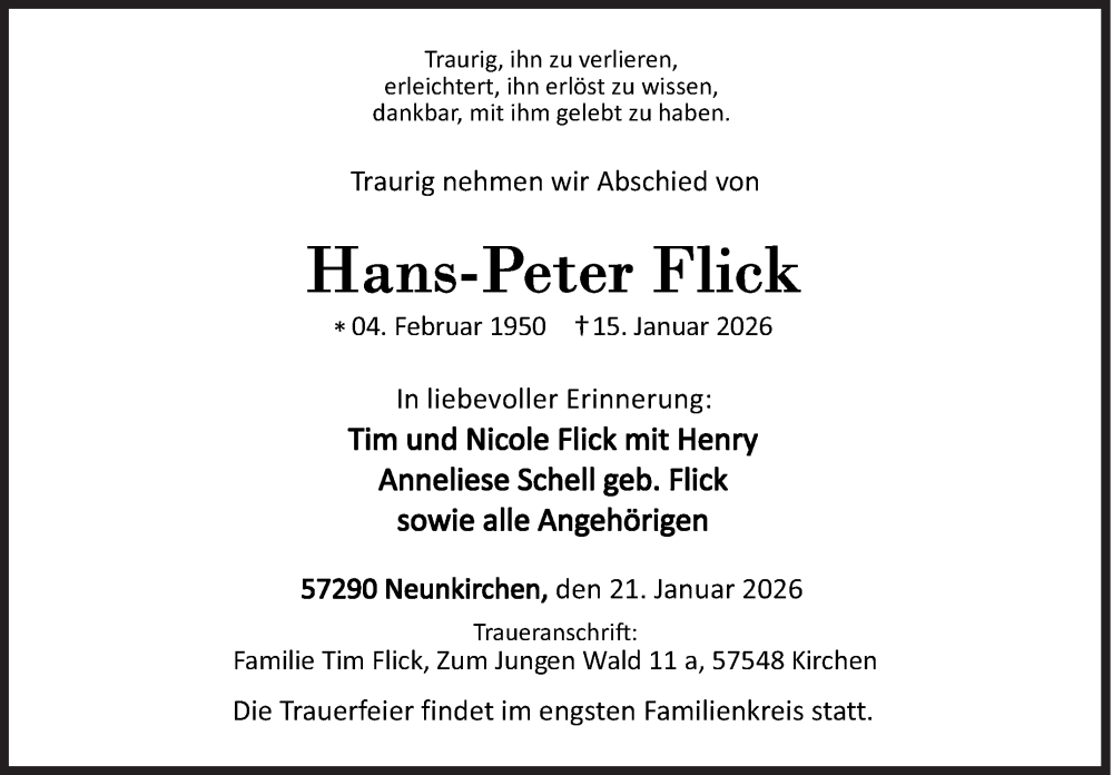 Hier finden Sie alle Traueranzeigen aus der Zeitung, die bisher für Hans-Peter Flick erschienen sind. Weitere Traueranzeigen, die in der Zeitung erscheinen, werden hier ebenfalls aufgelistet