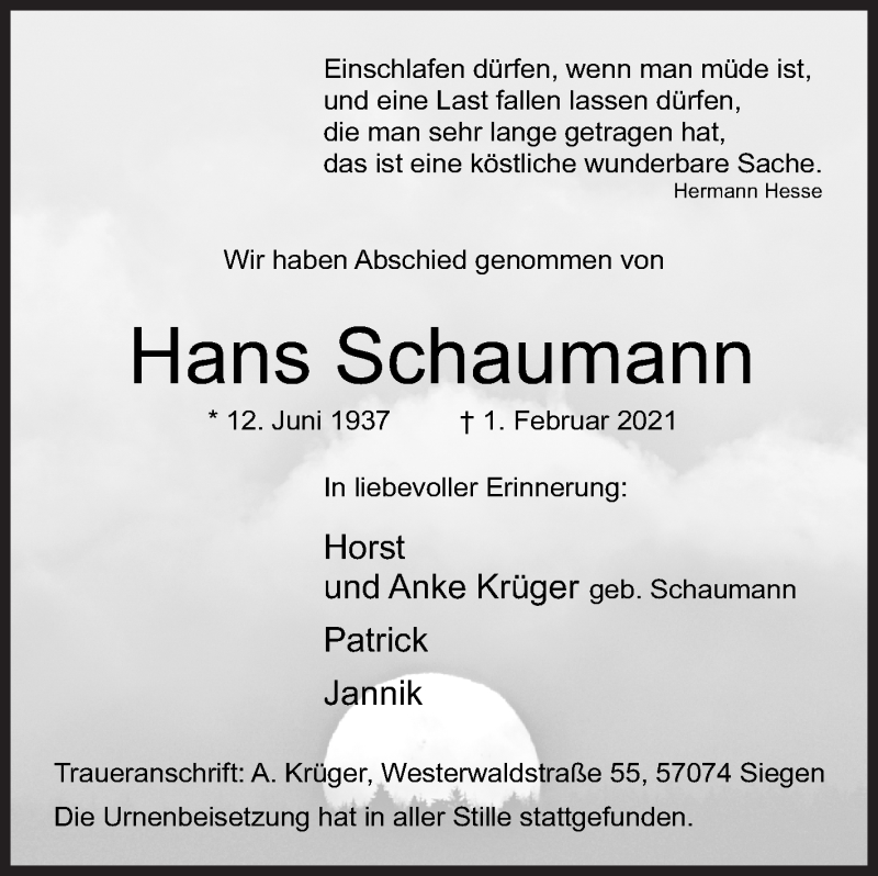 Hier finden Sie alle Traueranzeigen aus der Zeitung, die bisher für Hans Schaumann erschienen sind. Weitere Traueranzeigen, die in der Zeitung erscheinen, werden hier ebenfalls aufgelistet