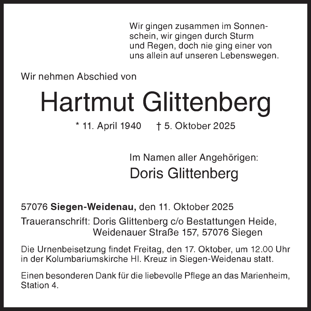 Hier finden Sie alle Traueranzeigen aus der Zeitung, die bisher für Hartmut Glittenberg erschienen sind. Weitere Traueranzeigen, die in der Zeitung erscheinen, werden hier ebenfalls aufgelistet