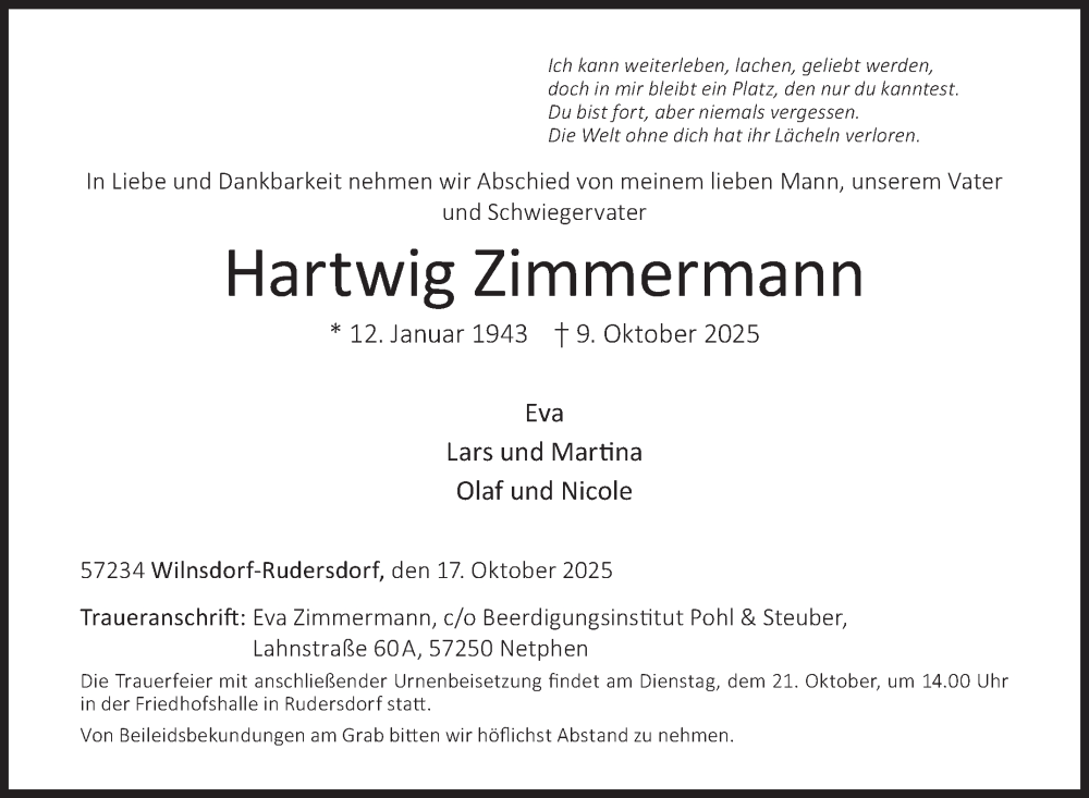 Hier finden Sie alle Traueranzeigen aus der Zeitung, die bisher für Hartwig Zimmermann erschienen sind. Weitere Traueranzeigen, die in der Zeitung erscheinen, werden hier ebenfalls aufgelistet