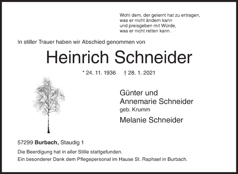 Hier finden Sie alle Traueranzeigen aus der Zeitung, die bisher für Heinrich Schneider erschienen sind. Weitere Traueranzeigen, die in der Zeitung erscheinen, werden hier ebenfalls aufgelistet