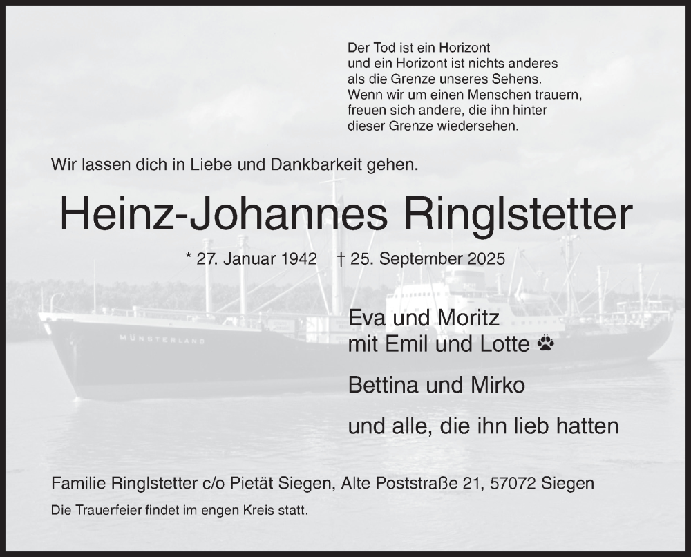 Hier finden Sie alle Traueranzeigen aus der Zeitung, die bisher für Heinz-Johannes Ringlstetter erschienen sind. Weitere Traueranzeigen, die in der Zeitung erscheinen, werden hier ebenfalls aufgelistet