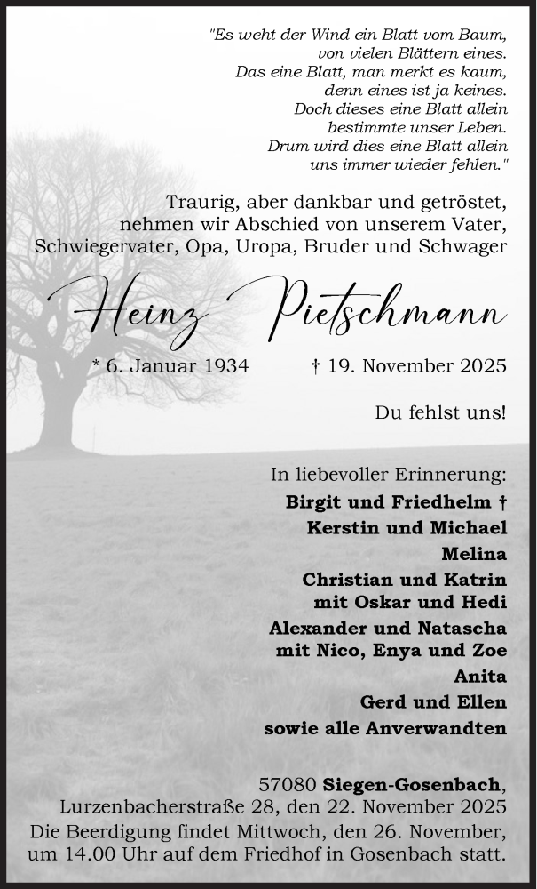 Hier finden Sie alle Traueranzeigen aus der Zeitung, die bisher für Heinz Pietschmann erschienen sind. Weitere Traueranzeigen, die in der Zeitung erscheinen, werden hier ebenfalls aufgelistet