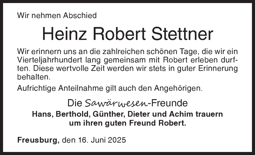 Hier finden Sie alle Traueranzeigen aus der Zeitung, die bisher für Heinz Robert Stettner erschienen sind. Weitere Traueranzeigen, die in der Zeitung erscheinen, werden hier ebenfalls aufgelistet