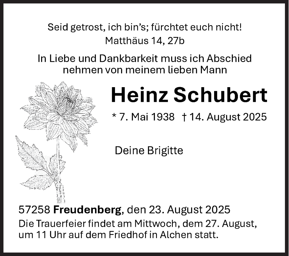 Hier finden Sie alle Traueranzeigen aus der Zeitung, die bisher für Heinz Schubert erschienen sind. Weitere Traueranzeigen, die in der Zeitung erscheinen, werden hier ebenfalls aufgelistet