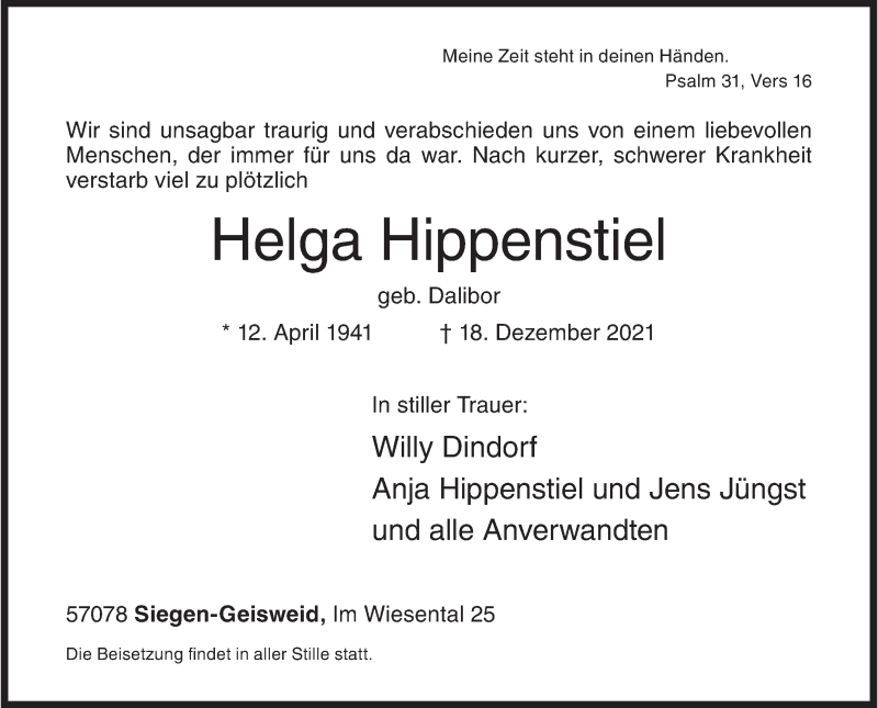 Hier finden Sie alle Traueranzeigen aus der Zeitung, die bisher für Helga Hippenstiel erschienen sind. Weitere Traueranzeigen, die in der Zeitung erscheinen, werden hier ebenfalls aufgelistet