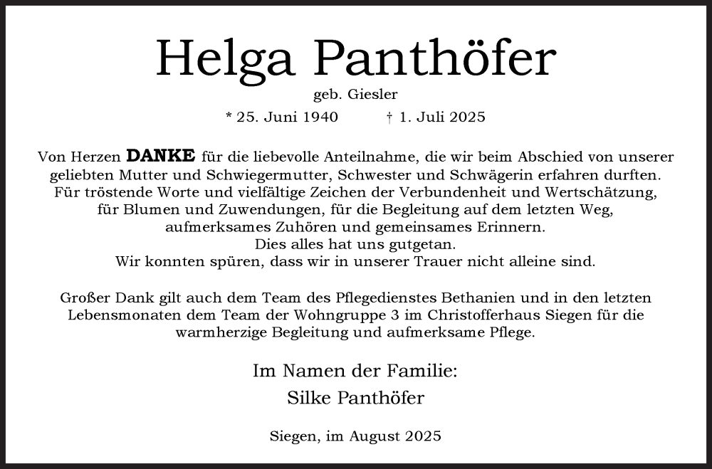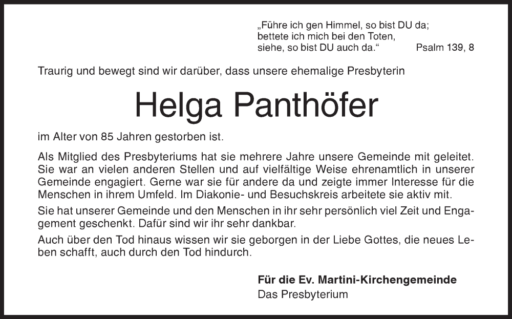 Hier finden Sie alle Traueranzeigen aus der Zeitung, die bisher für Helga Panthöfer erschienen sind. Weitere Traueranzeigen, die in der Zeitung erscheinen, werden hier ebenfalls aufgelistet