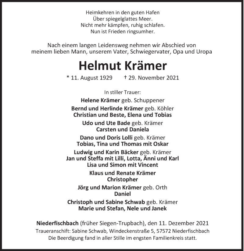 Hier finden Sie alle Traueranzeigen aus der Zeitung, die bisher für Helmut Krämer erschienen sind. Weitere Traueranzeigen, die in der Zeitung erscheinen, werden hier ebenfalls aufgelistet