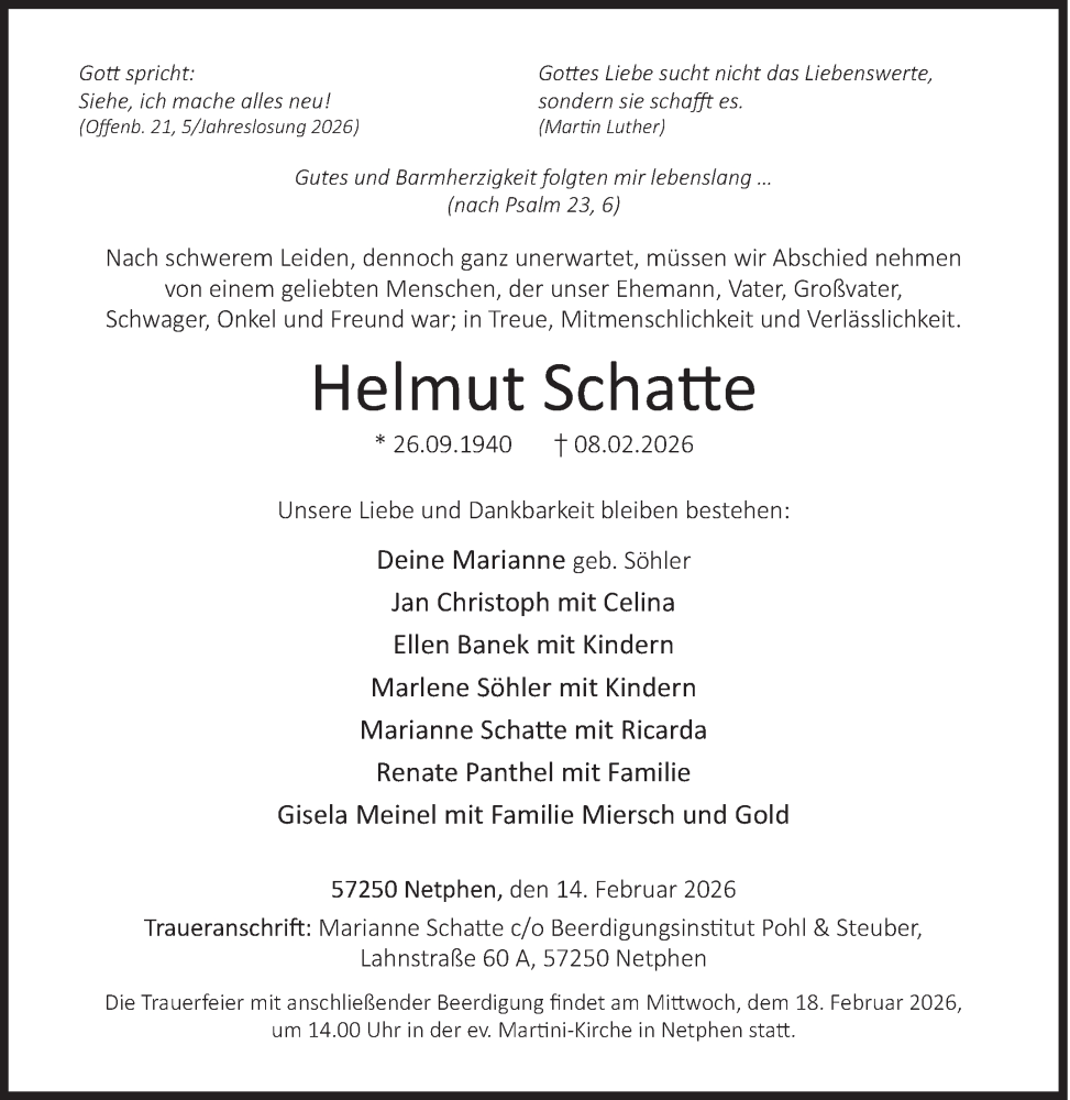 Hier finden Sie alle Traueranzeigen aus der Zeitung, die bisher für Helmut Schatte erschienen sind. Weitere Traueranzeigen, die in der Zeitung erscheinen, werden hier ebenfalls aufgelistet