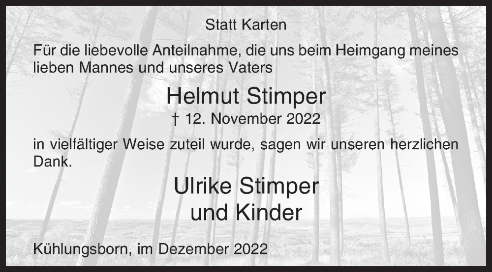 Hier finden Sie alle Traueranzeigen aus der Zeitung, die bisher für Helmut Stimper erschienen sind. Weitere Traueranzeigen, die in der Zeitung erscheinen, werden hier ebenfalls aufgelistet