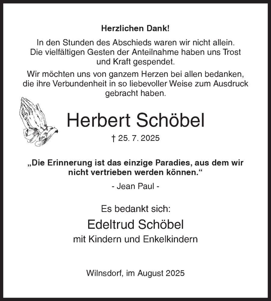 Hier finden Sie alle Traueranzeigen aus der Zeitung, die bisher für Herbert Schöbel erschienen sind. Weitere Traueranzeigen, die in der Zeitung erscheinen, werden hier ebenfalls aufgelistet