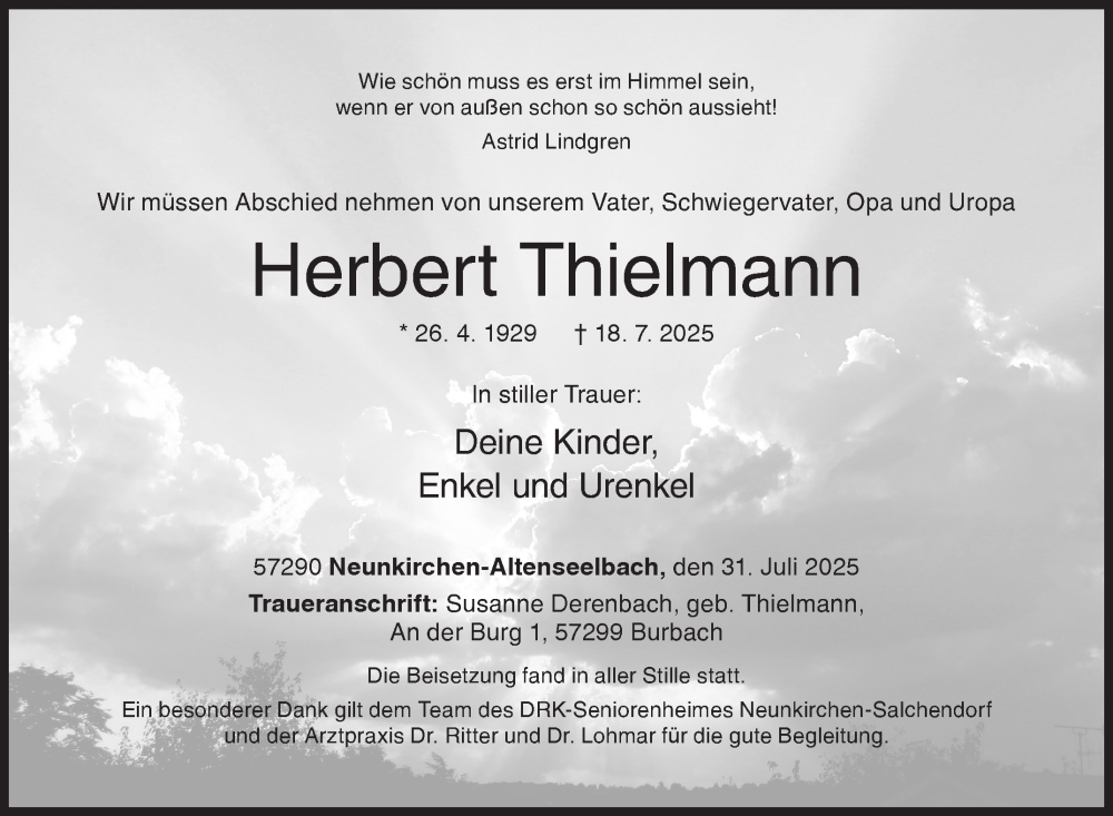 Hier finden Sie alle Traueranzeigen aus der Zeitung, die bisher für Herbert Thielmann erschienen sind. Weitere Traueranzeigen, die in der Zeitung erscheinen, werden hier ebenfalls aufgelistet