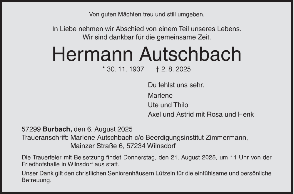 Hier finden Sie alle Traueranzeigen aus der Zeitung, die bisher für Hermann Autschbach erschienen sind. Weitere Traueranzeigen, die in der Zeitung erscheinen, werden hier ebenfalls aufgelistet