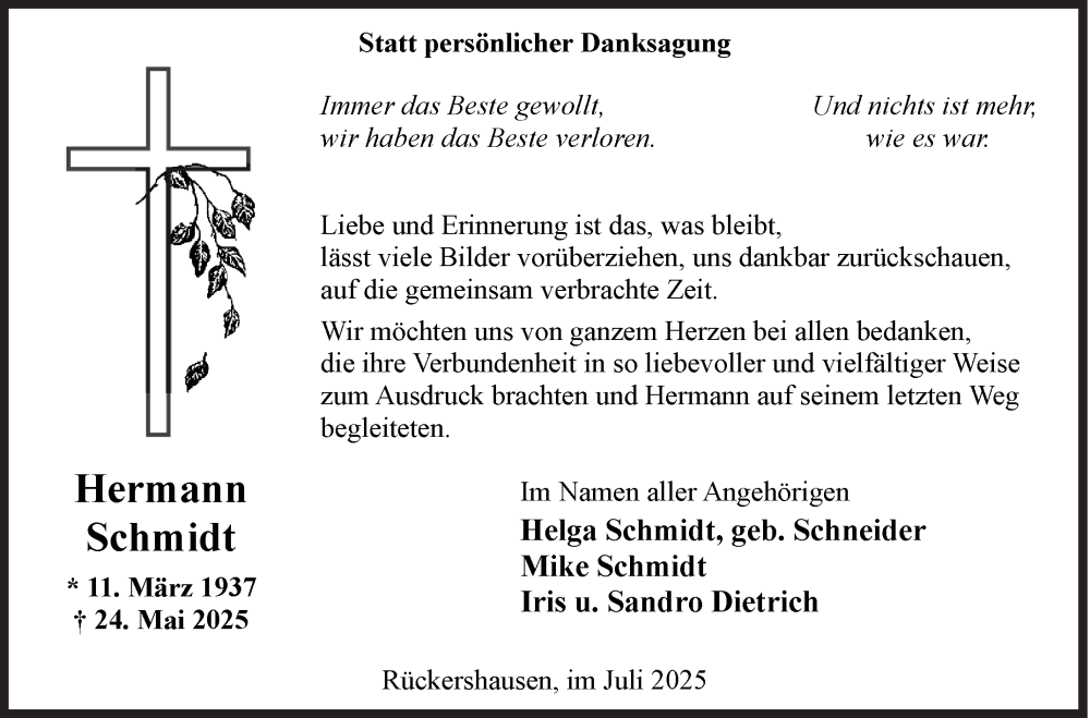 Hier finden Sie alle Traueranzeigen aus der Zeitung, die bisher für Hermann Schmidt erschienen sind. Weitere Traueranzeigen, die in der Zeitung erscheinen, werden hier ebenfalls aufgelistet