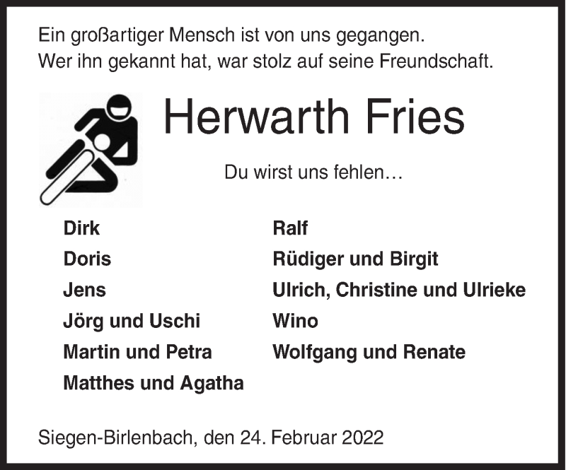 Hier finden Sie alle Traueranzeigen aus der Zeitung, die bisher für Herwarth Fries erschienen sind. Weitere Traueranzeigen, die in der Zeitung erscheinen, werden hier ebenfalls aufgelistet