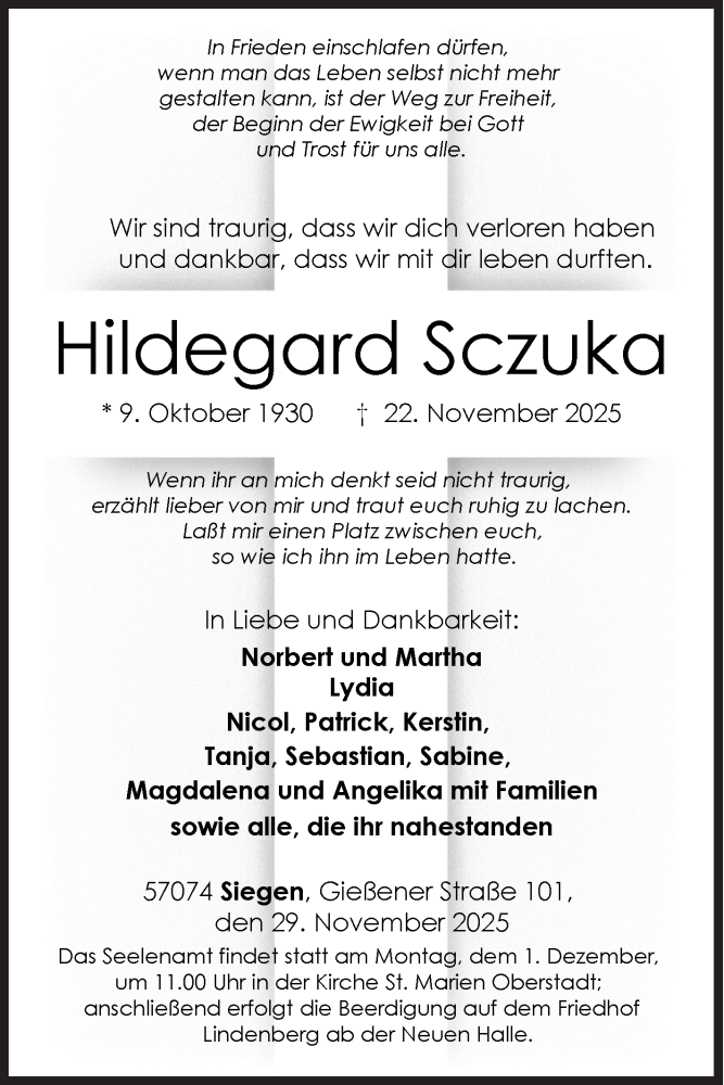Hier finden Sie alle Traueranzeigen aus der Zeitung, die bisher für Hildegard Sczuka erschienen sind. Weitere Traueranzeigen, die in der Zeitung erscheinen, werden hier ebenfalls aufgelistet
