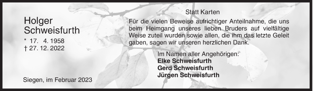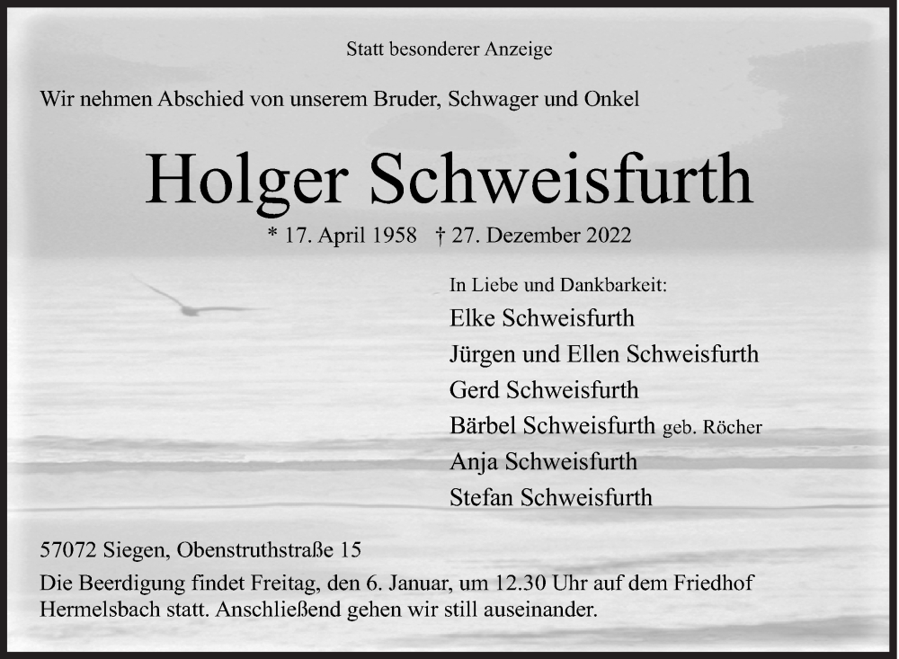 Hier finden Sie alle Traueranzeigen aus der Zeitung, die bisher für Holger Schweisfurth erschienen sind. Weitere Traueranzeigen, die in der Zeitung erscheinen, werden hier ebenfalls aufgelistet