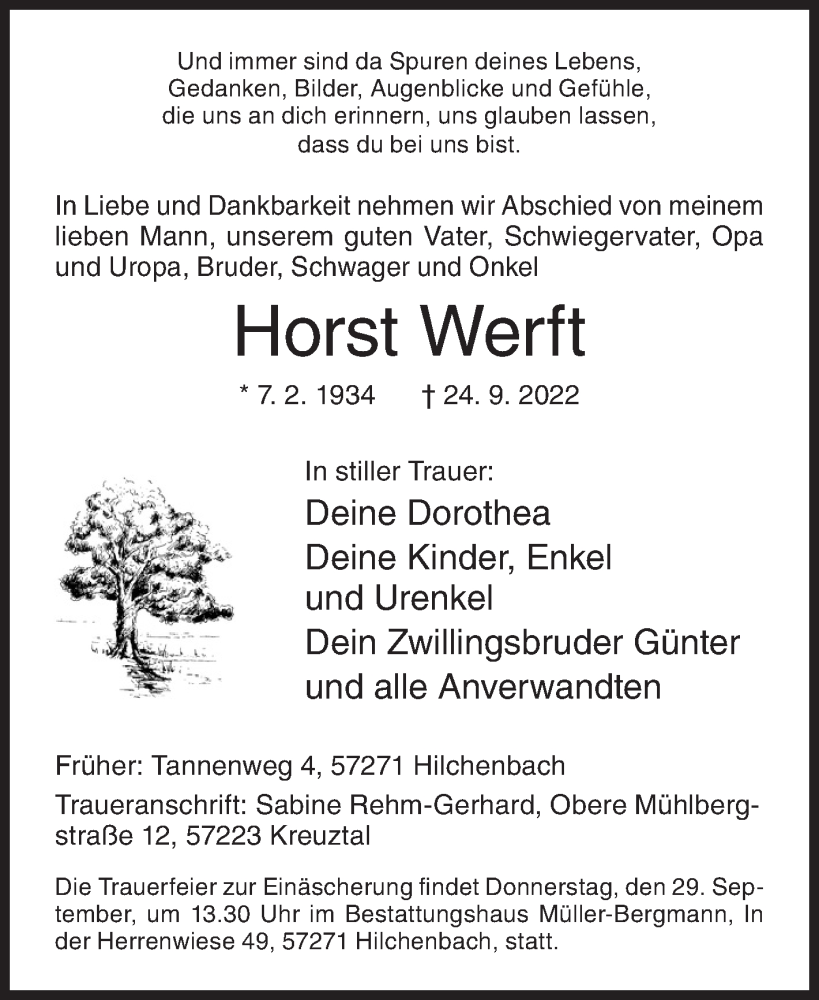 Hier finden Sie alle Traueranzeigen aus der Zeitung, die bisher für Horst Werft erschienen sind. Weitere Traueranzeigen, die in der Zeitung erscheinen, werden hier ebenfalls aufgelistet