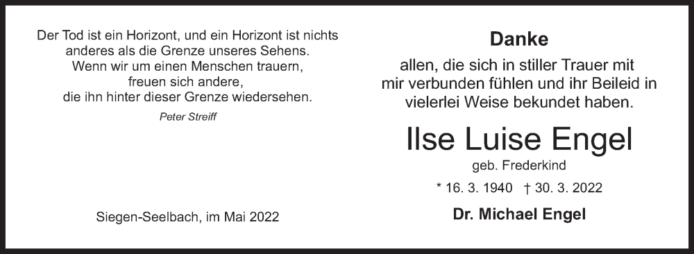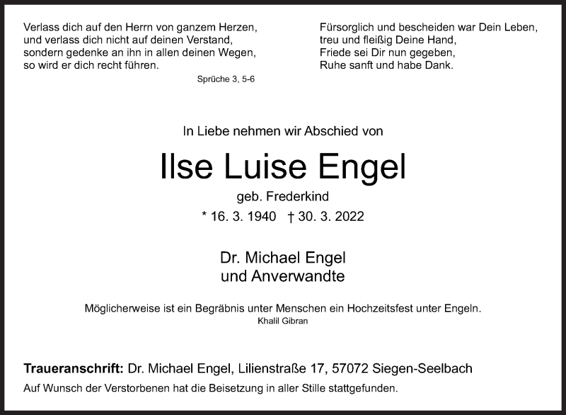 Hier finden Sie alle Traueranzeigen aus der Zeitung, die bisher für Ilse Luise Engel erschienen sind. Weitere Traueranzeigen, die in der Zeitung erscheinen, werden hier ebenfalls aufgelistet