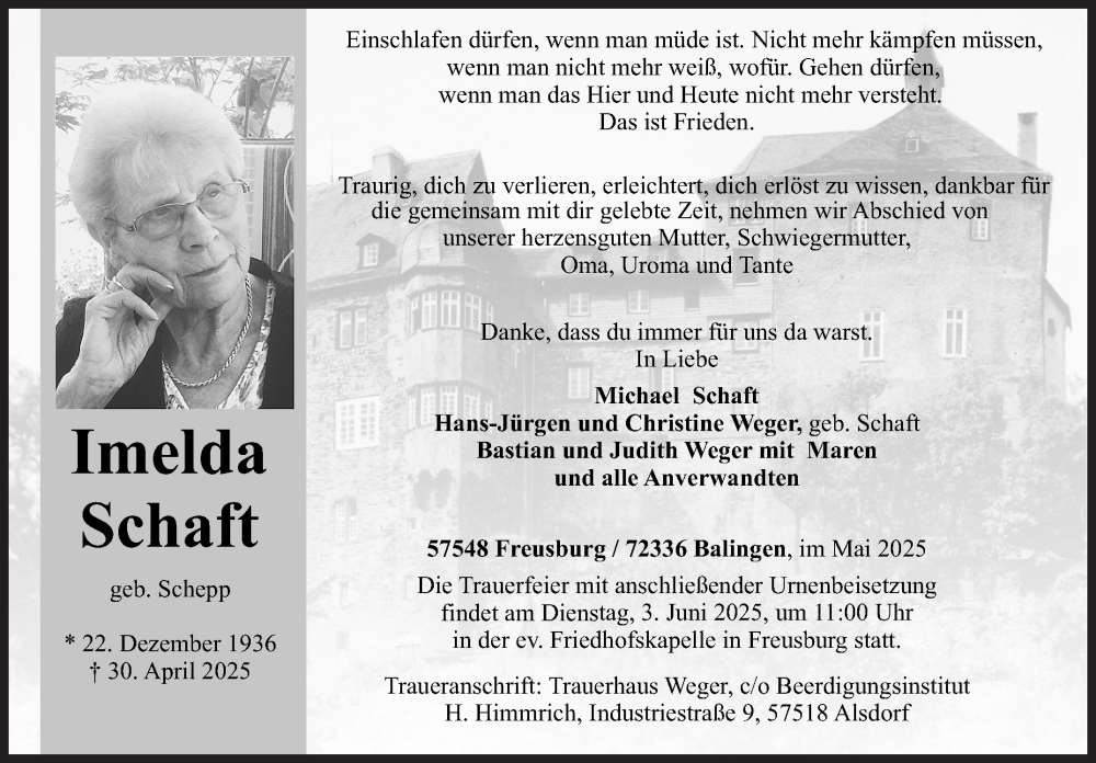 Hier finden Sie alle Traueranzeigen aus der Zeitung, die bisher für Imelda Schaft erschienen sind. Weitere Traueranzeigen, die in der Zeitung erscheinen, werden hier ebenfalls aufgelistet