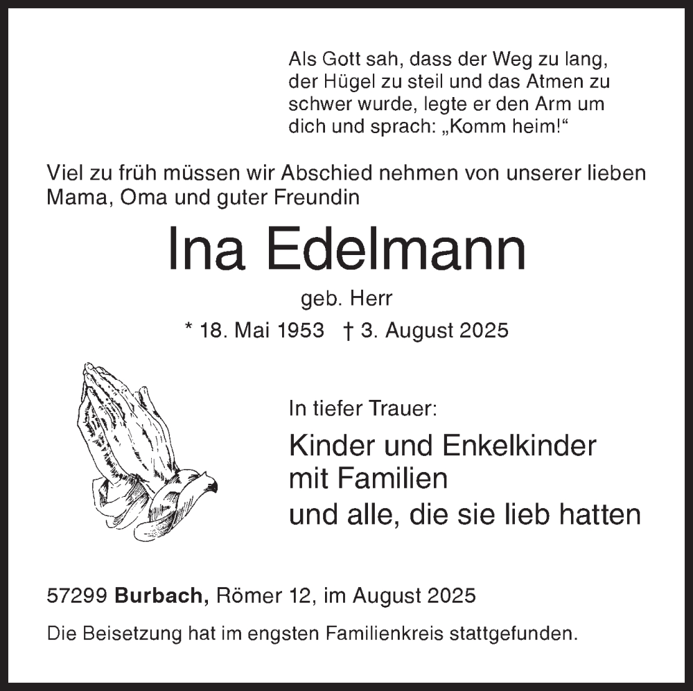 Hier finden Sie alle Traueranzeigen aus der Zeitung, die bisher für Ina Edelmann erschienen sind. Weitere Traueranzeigen, die in der Zeitung erscheinen, werden hier ebenfalls aufgelistet